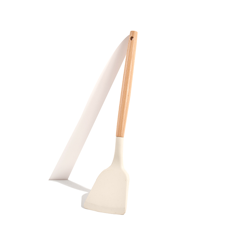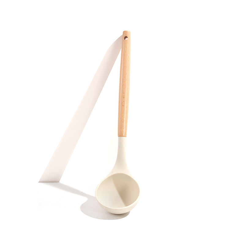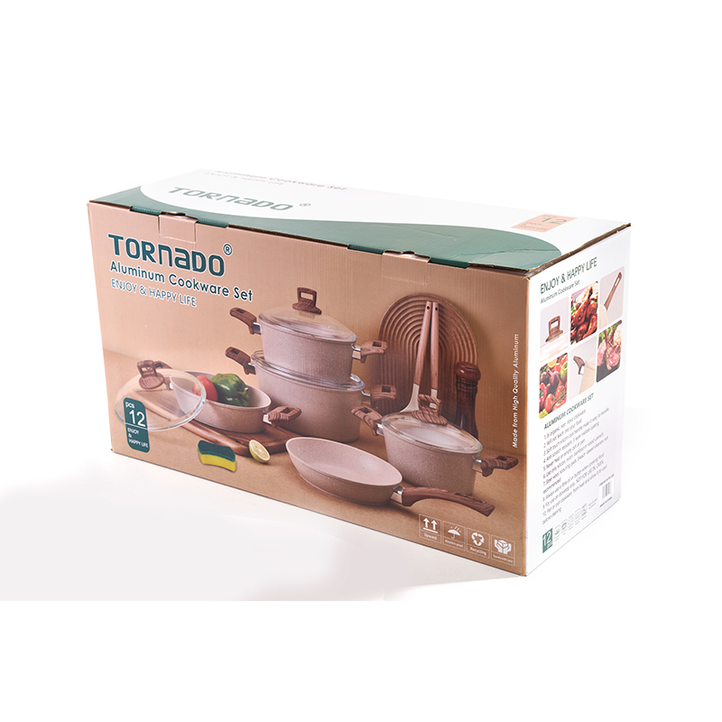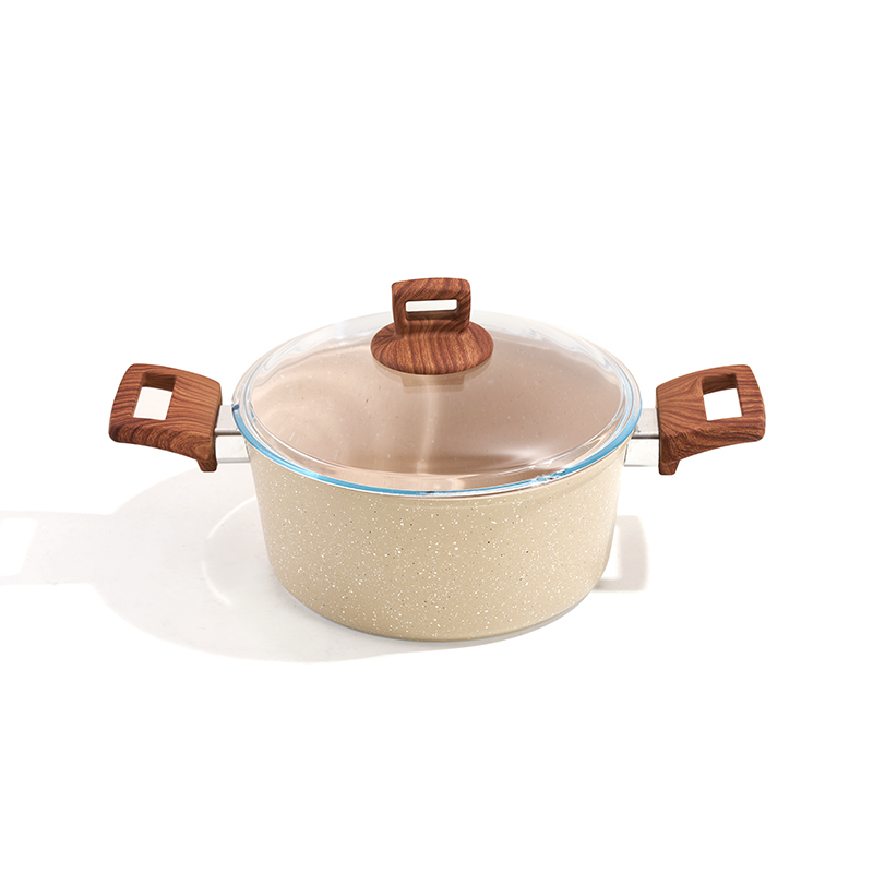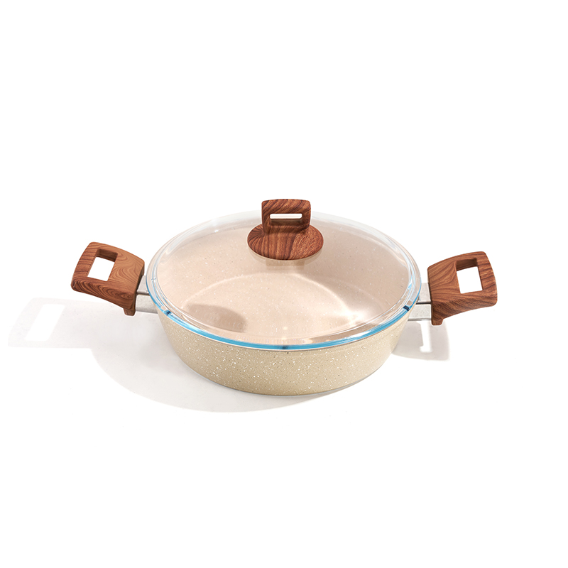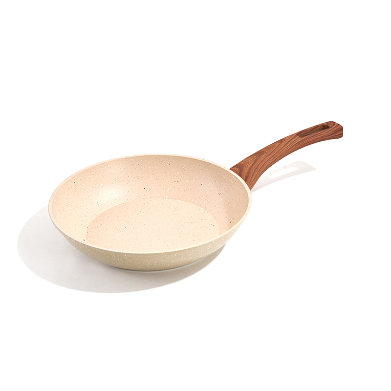 Cuerpo ligero de textura granítica de color beige, mangos de madera resistentes al calor, completo con utensilios de silicona y esponja limpiadora, multitamaños apilables, ideal para freír y guisar, antiadherente y fácil de limpiar.
