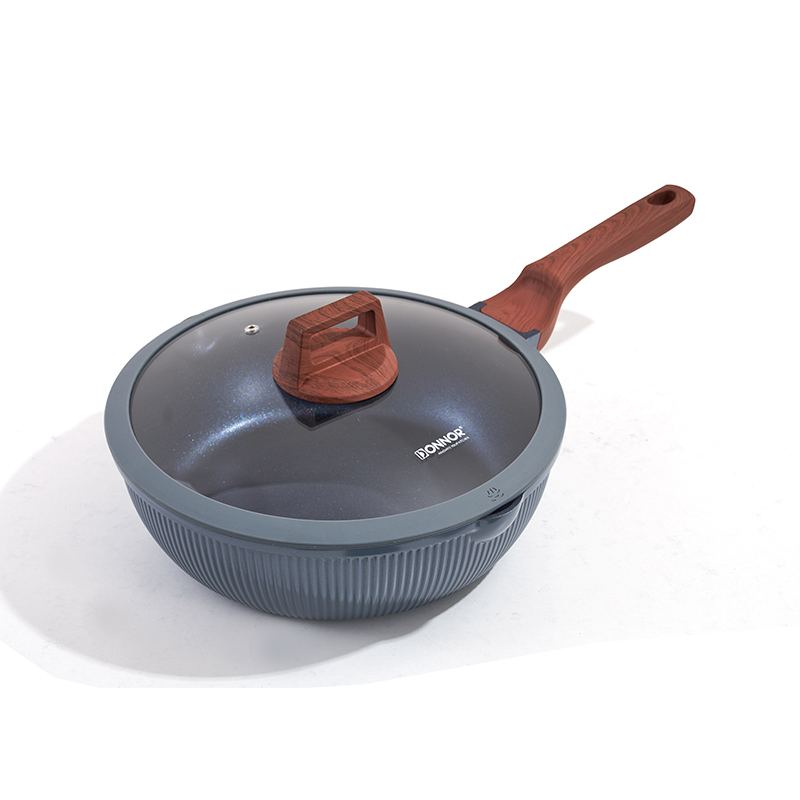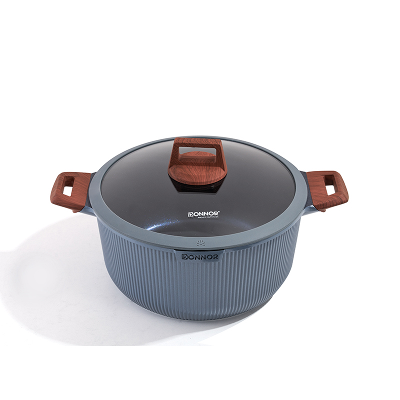 Cuerpo acanalado gris oscuro con asas de madera resistentes al calor, diseño apilable para ahorrar espacio, completo con salvamanteles y utensilios, compatible con todas las estufas, ideal para freír y guisar.