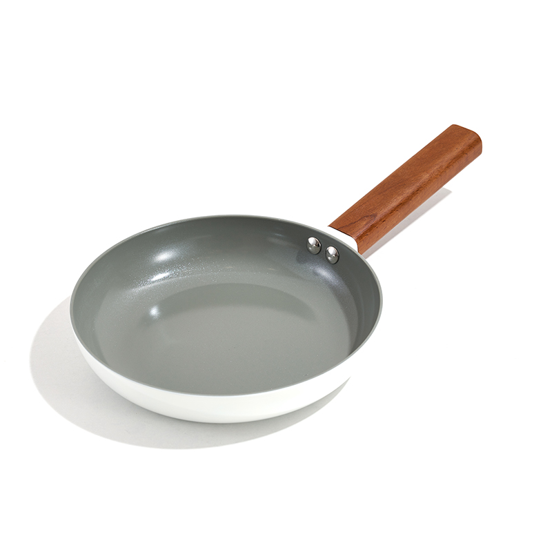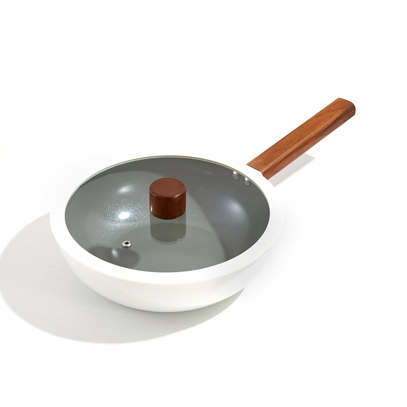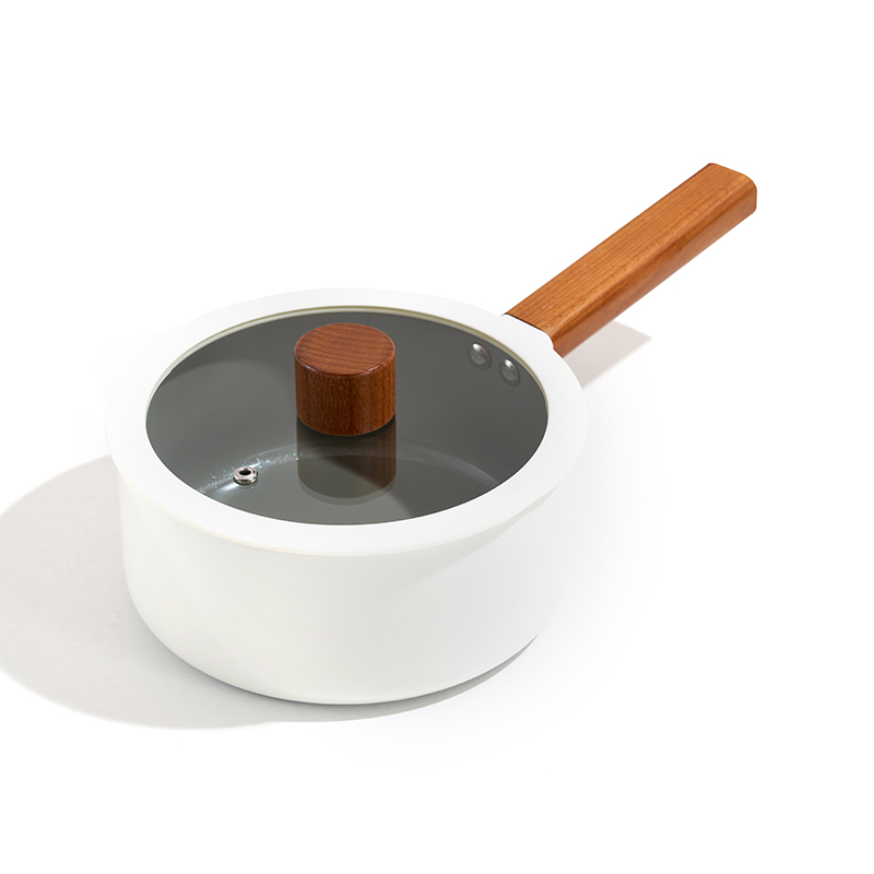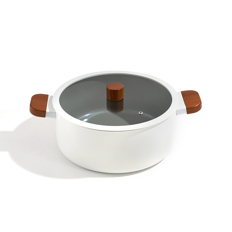 Este juego de utensilios de cocina tiene un revestimiento interior antiadherente de cerámica, un mango de madera resistente al calor, funciona en varias estufas, es adecuado para guisar/freír y tiene un diseño blanco minimalista para todos los estilos de cocina.