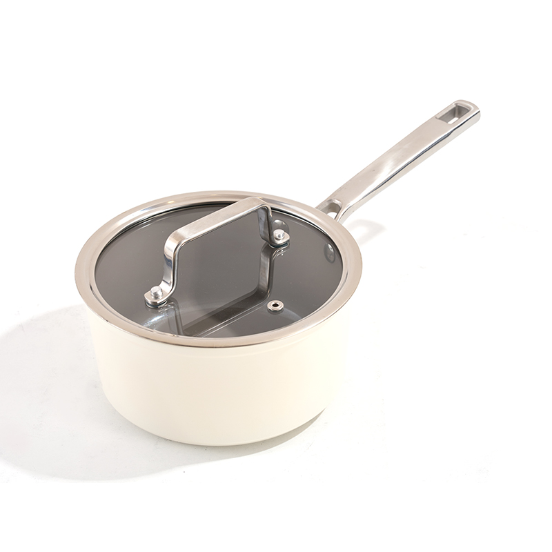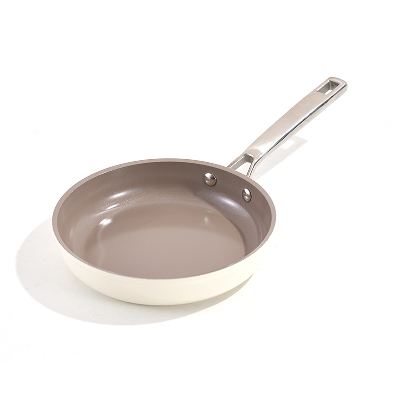 Exterior color crema con interior antiadherente gris claro, manijas ergonómicas de acero inoxidable y perillas de tapa, construcción sin costuras, tamaños múltiples para freír y guisar, estilo minimalista, fácil de limpiar y duradero.