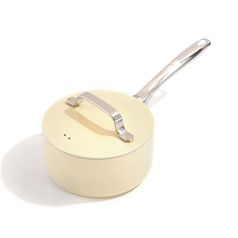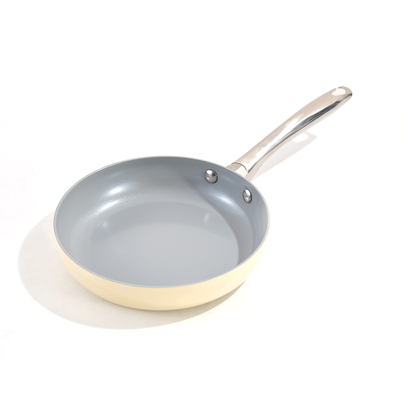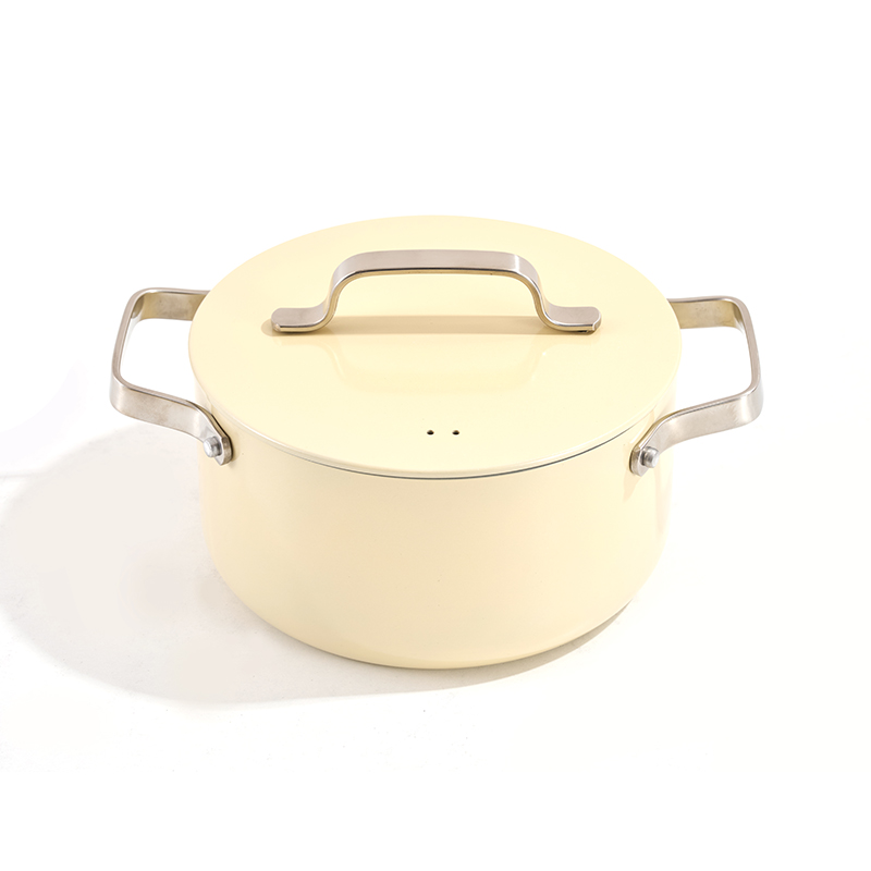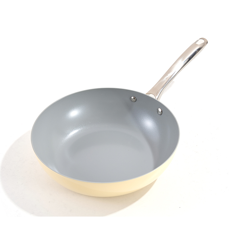 Exterior amarillo mantequilla con interior antiadherente gris claro, manijas y perillas de tapa de acero inoxidable, construcción sin costuras, tamaños múltiples para freír y guisar, estilo minimalista, fácil de limpiar y duradero.